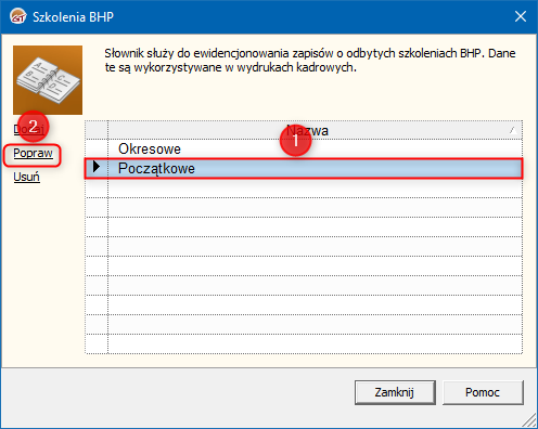 ​Słownik Szkolenia BHP w programie Gratyfikant GT służy do ewidencjonowania zapisów i odbytych szkoleniach BHP. Dane te są wykorzystywane w wydrukach kadrowych. W celu edycji nazwy szkolenia BHP należy:
