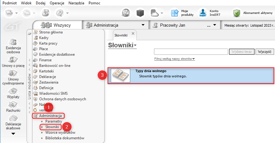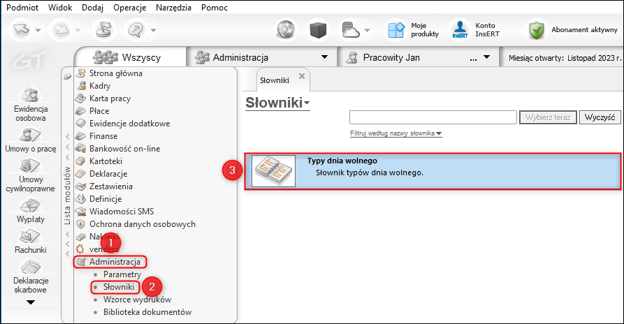 1. Z listy modułów wybrać Administracja – Słowniki, a z listy słowników Typy dnia wolnego.