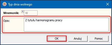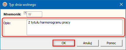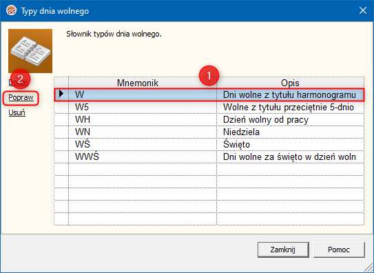 2. W oknie, które się wyświetli zaznaczyć Typ dnia wolnego, którego opis zostanie zmieniony i kliknąć opcję Popraw.