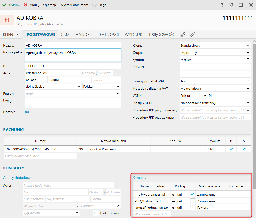 Dzięki funkcji Miejsca użycia kontaktu użytkownik może przypisać kontakt do dokumentów takich jak faktury, oferty, dokumenty związane z serwisem i windykacją oraz zamówienia.