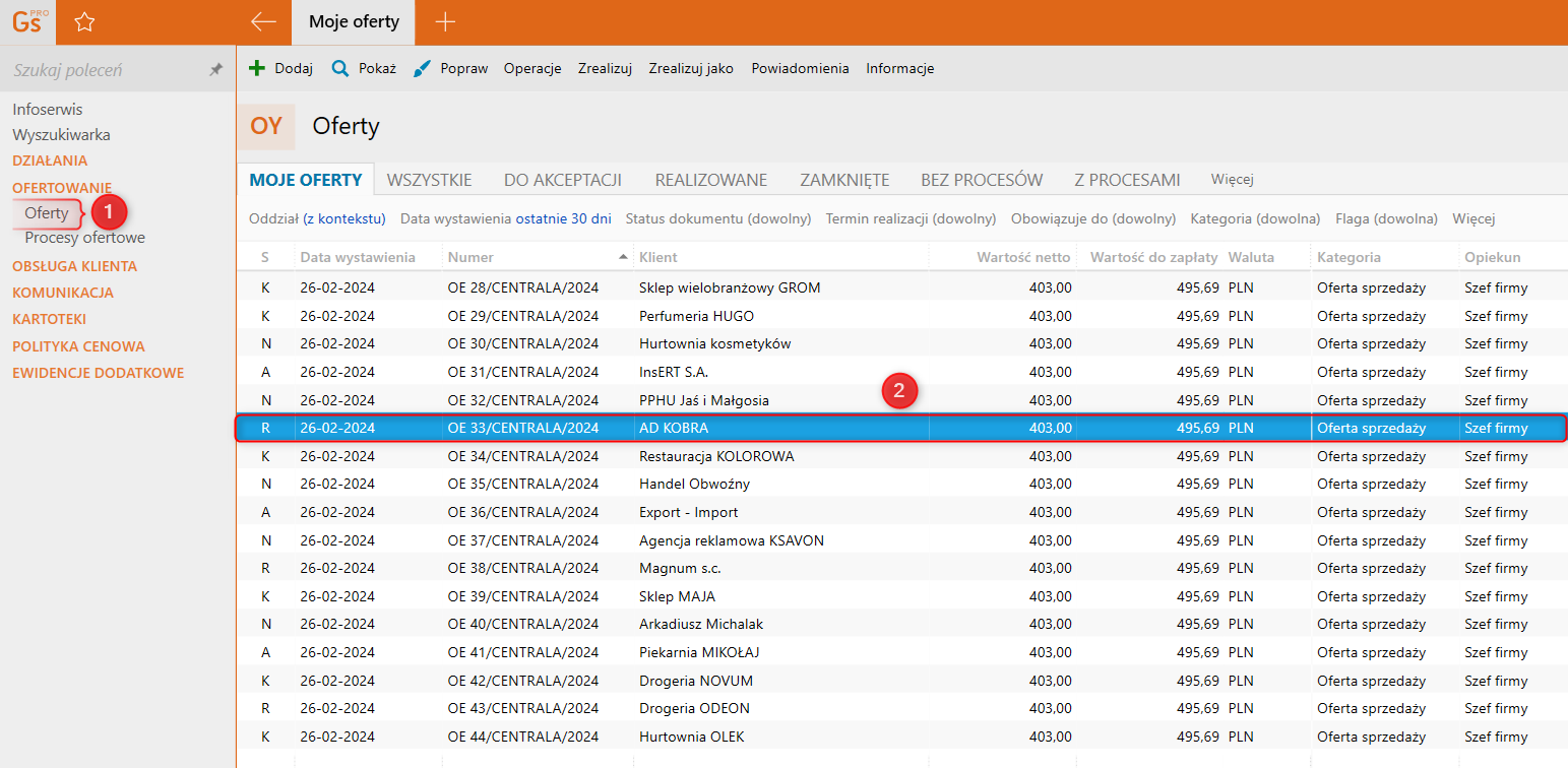 1. Przejść do modułu Ofertowanie – Oferty. Zaznaczyć ofertę na liście.