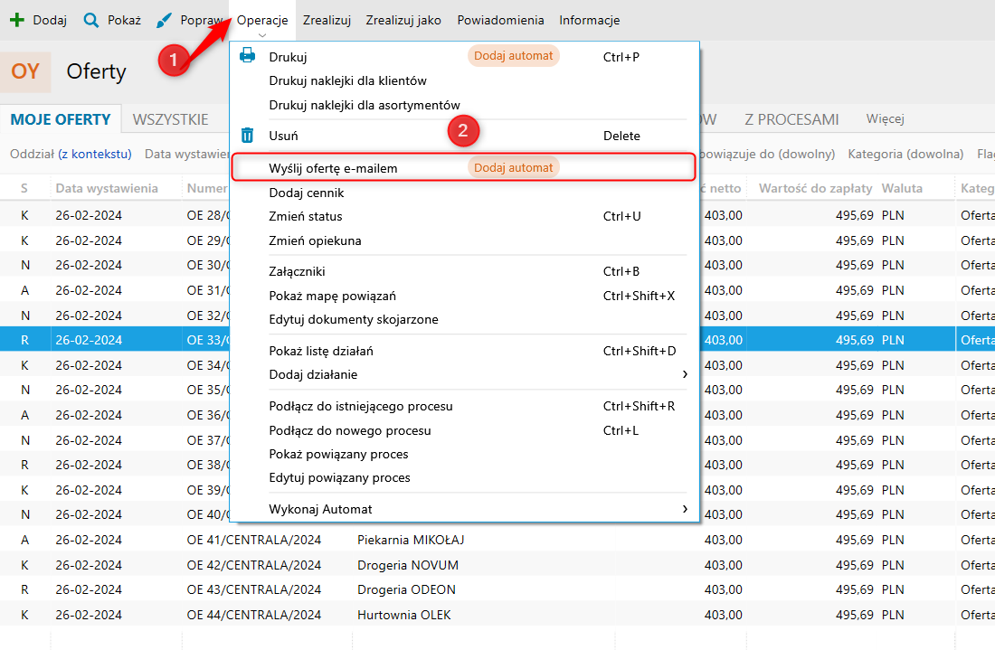 2. Z górnego menu Operacje wybrać Wyślij ofertę e-mailem.