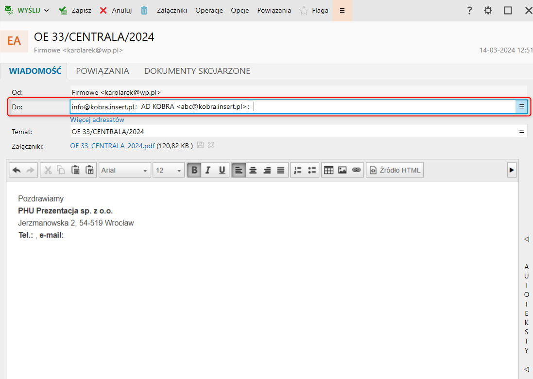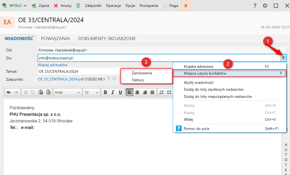 Od wersji 50.0.0 Gestora nexo dodano możliwość skorzystania z miejsc użycia kontaktów w wiadomości pocztowej oraz w kreatorze wysyłki zbiorczej. W tym celu (na przykładzie wysyłki Oferty e-mailem), należy: