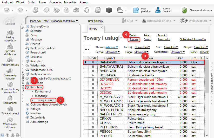1. Z listy modułów wybrać Kartoteki – Towary i usługi, zaznaczyć towar, który będzie miał wprowadzony kod CN i kliknąć opcję Popraw.
