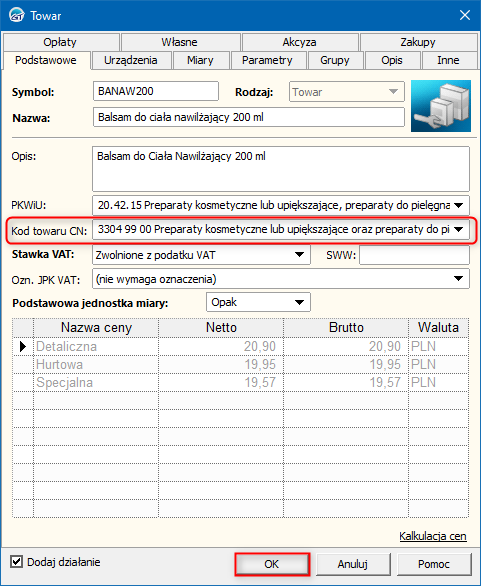 2. Wybrać odpowiedni kod towaru CN. Zapisać przyciskiem OK.
