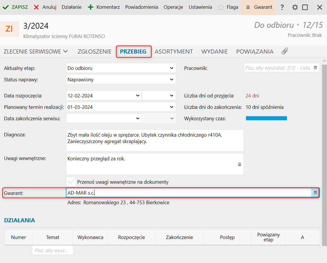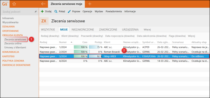 1. Przejść do modułu Obsługa klienta – Zlecenia serwisowe. Następnie zaznaczyć zlecenie na liście.