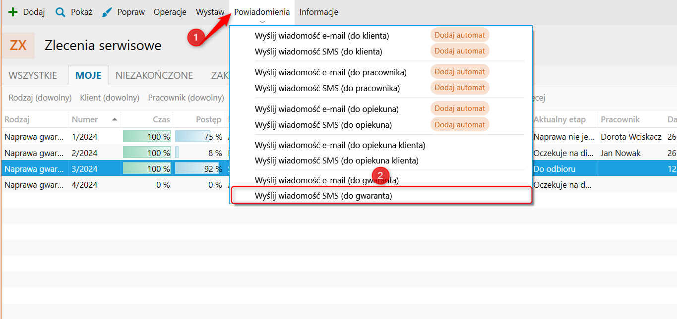 2. Z górnego menu Powiadomienia wybrać Wyślij wiadomość SMS (do gwaranta).