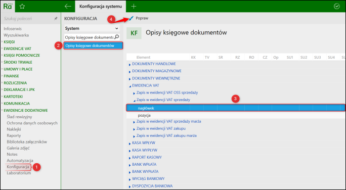 1. Przejść do modułu Konfiguracja – Opisy księgowe dokumentów i edytować ustawienia nagłówka Zapisu ewidencji VAT.