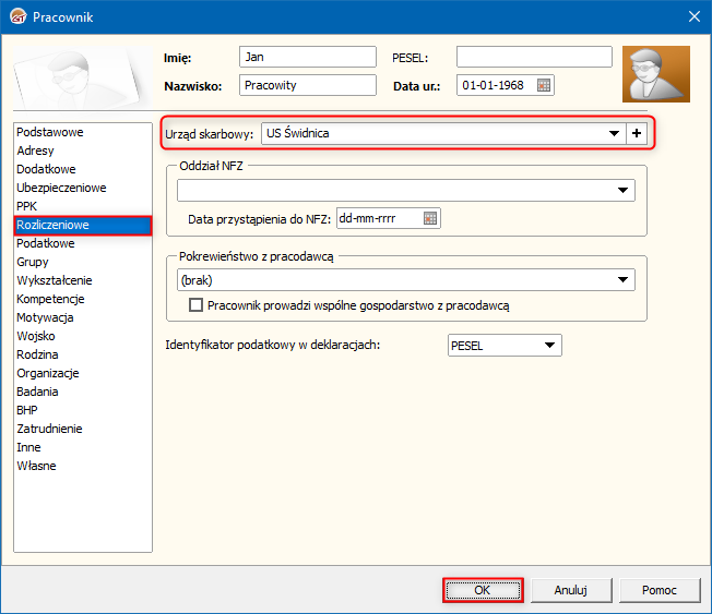 2. Przejść na zakładkę Rozliczeniowe i wskazać Urząd skarbowy pracownika. Jeżeli Urzędu nie ma na liście należy go dodać. Zmiany zapisać przyciskiem OK.