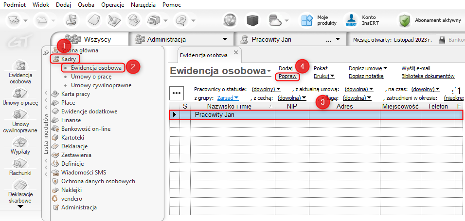 1. Z listy modułów wybrać Kadry – Ewidencja osobowazaznaczyć pracownika, któremu zostanie wskazany identyfikator podatkowy w deklaracjach i wybrać opcję Popraw.