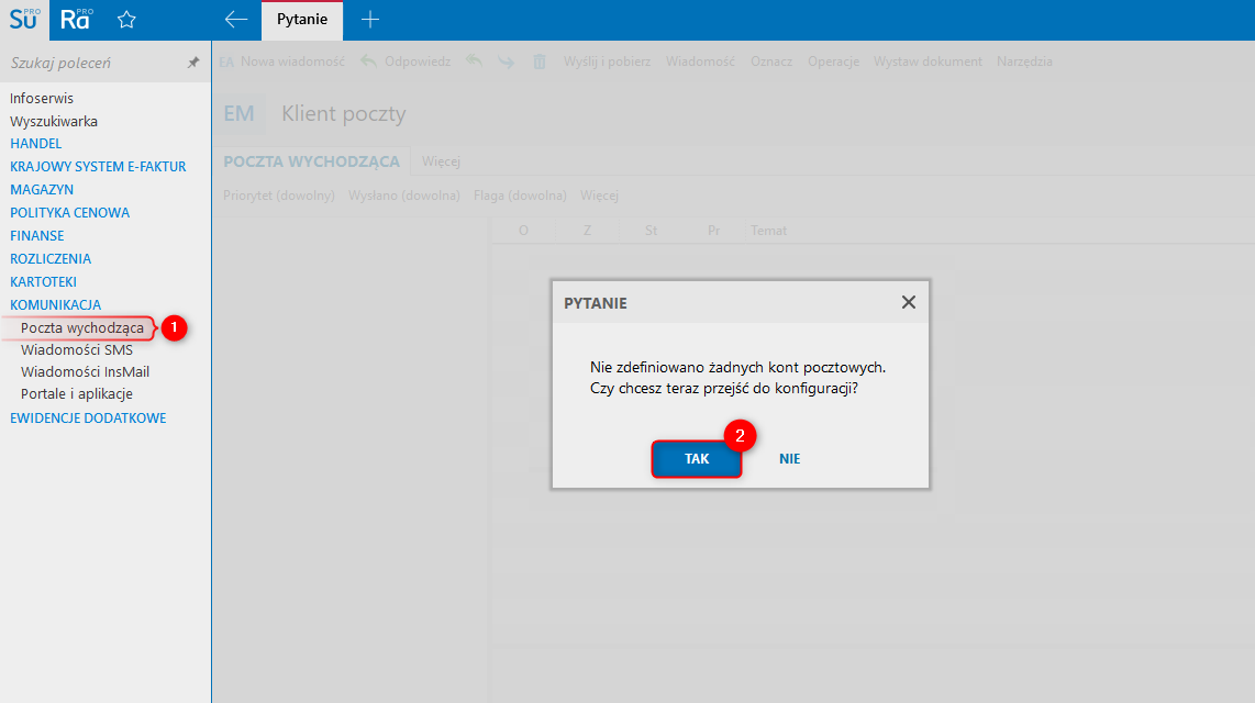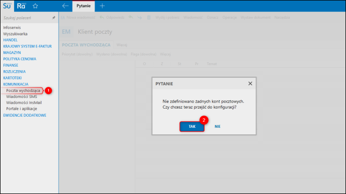 1. Przejść do modułu Poczta wychodząca, a gdy pojawi się pytanie dot. Konfiguracji zatwierdzić przyciskiem TAK.