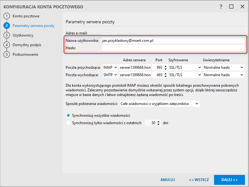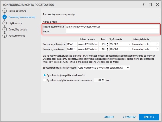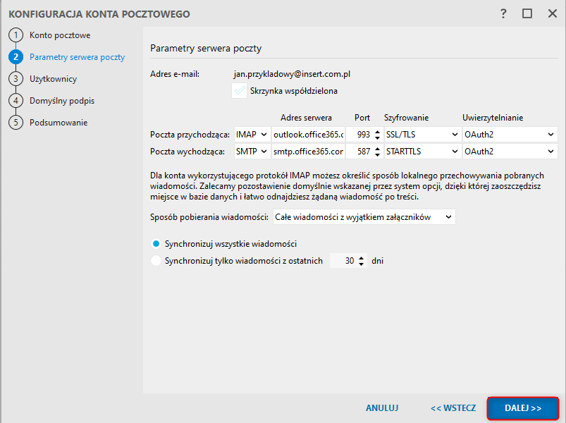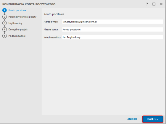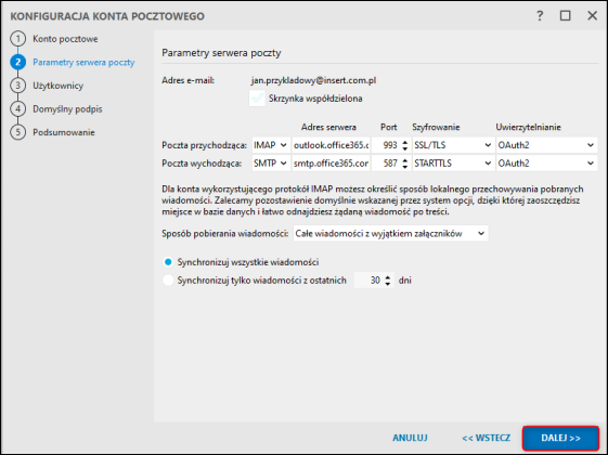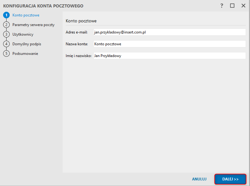 3. Jeżeli program pobierze automatycznie dane z serwerów, to w kolejnym kroku należy uzupełnić parametry poczty wychodzącej oraz przychodzącej, a zmiany zatwierdzić przyciskiem Dalej.
