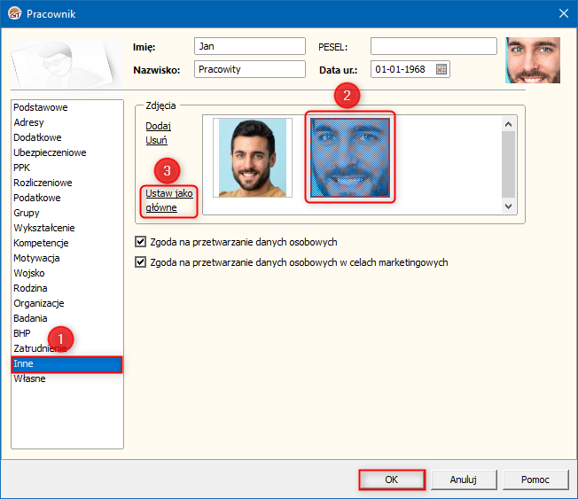 2. Przejść na zakładkę Inne, zaznaczyć zdjęcie, które zostanie ustawione jako główne i kliknąć opcję Ustaw jako główne. Jeżeli zdjęcia nie ma w kartotece, to należy je dodać. Zdjęcie główne jest oznaczone czerwoną ramką. Zmiany w kartotece zapisać przyciskiem OK.