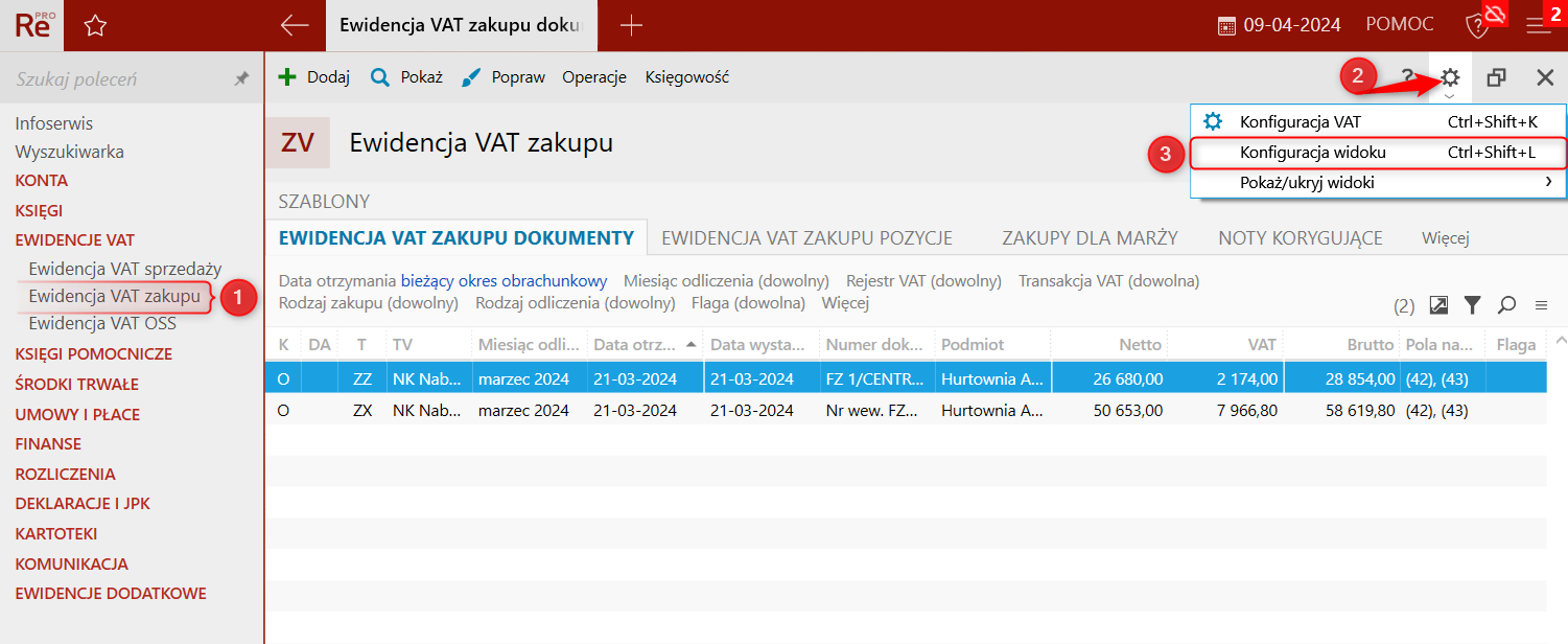 1. Przejść do modułu Ewidencje VAT – Ewidencje VAT zakupu. Kliknąć prawym górnym rogu ikonę "koła zębatego", następnie wybrać Konfiguracja widoku.