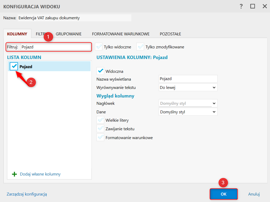 Rachmistrz nexo i Rewizor nexo – Jak dodać kolumnę informującą o powiązanym pojeździe z zapisem VAT zakupu?