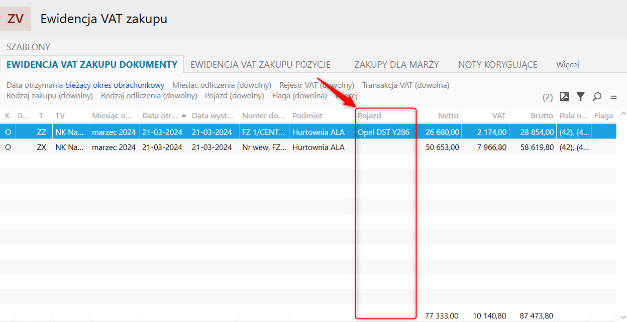 Od wersji 50.0.0 programów Rachmistrz nexo i Rewizor nexo została dodana możliwość wskazania pojazdu z kartoteki przy tworzeniu zapisów VAT i KPiR. Dzięki temu rozwiązaniu użytkownik ma możliwość filtrowania zapisów według wybranego pojazdu, a także w przypadku zakupu związanego z leasingiem, program automatycznie uzupełni wartość nabycia pojazdu. Aby dodać kolumnę informującą o pojeździe, który znajduje się na Zapisie VAT zakupu, należy: