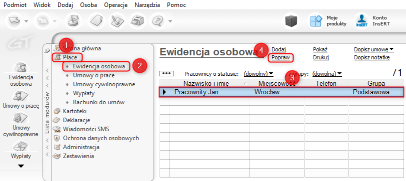 1. Z listy modułów wybrać Płace – Ewidencja osobowa, zaznaczyć pracownika, któremu zostanie dodane zdjęcie i kliknąć opcję Popraw.