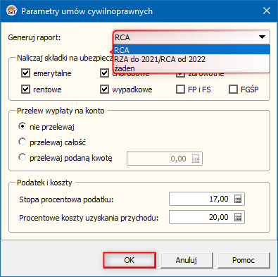 2. W oknie Parametry umów cywilnoprawnych wskazać domyślną wartość w polu Generuj raport. Zmiany zapisać przyciskiem OK.