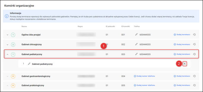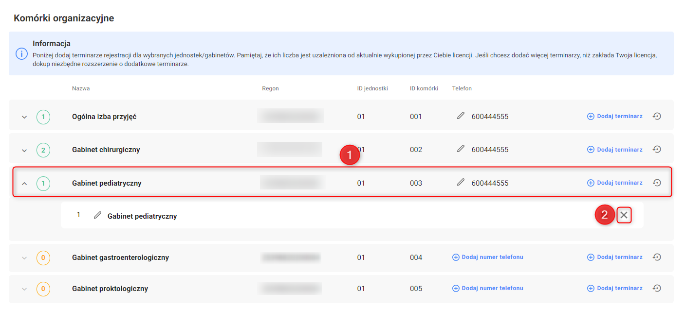 2. W sekcji Komórki organizacyjne znaleźć terminarz do usunięcia i kliknąć przy nim symbol X.