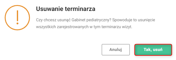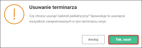 3. Zapoznać się z treścią komunikatu i potwierdzić chęć usunięcia terminarza przyciskiem Tak, usuń.
