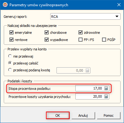 2. W oknie Parametry umów cywilnoprawnych wpisać domyślną Stopę procentową podatku. Zmiany zapisać przyciskiem OK.
