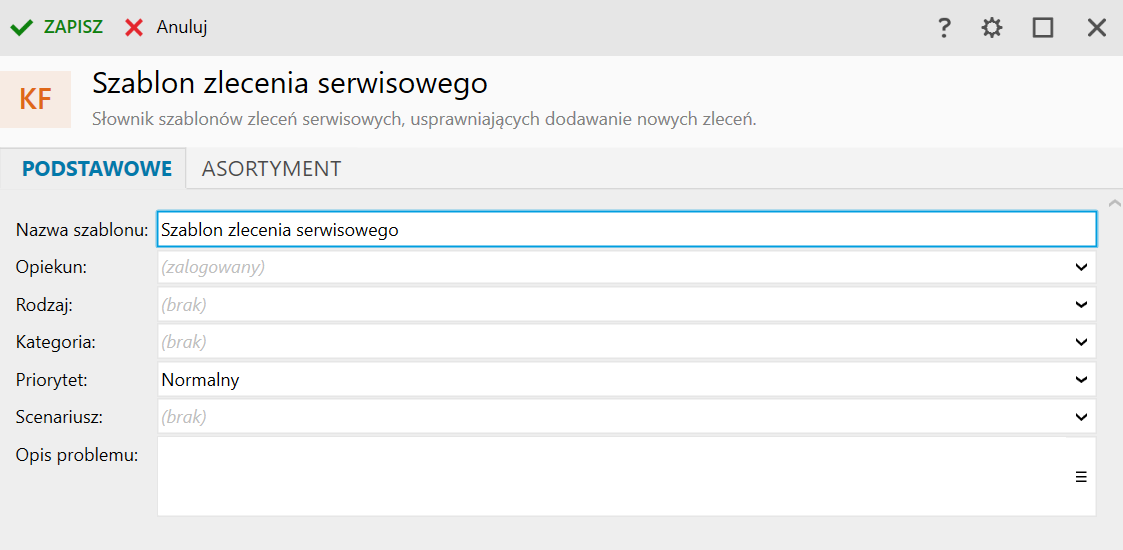 2. Uzupełnić formularz tworzenia szablonu zlecenia serwisowego i zatwierdzić przyciskiem Zapisz.