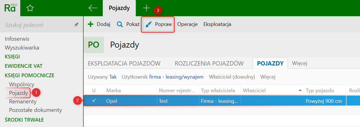 1. Przejść do modułu Pojazdy, zaznaczyć wybraną pozycję i kliknąć Popraw.