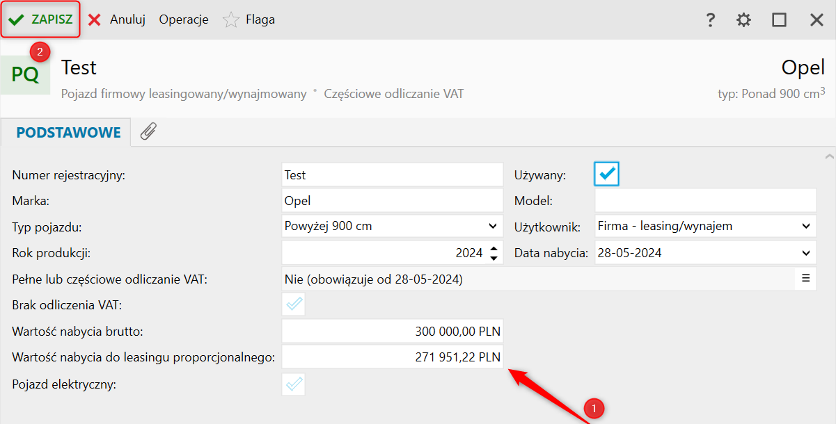 2. Uzupełnić kwotę w polu Wartość nabycia brutto – na jej podstawie program wyliczy Wartość nabycia do leasingu proporcjonalnego, czyli sumę wartości netto oraz 50% wartości VAT. Zmiany zatwierdzić przyciskiem Zapisz.