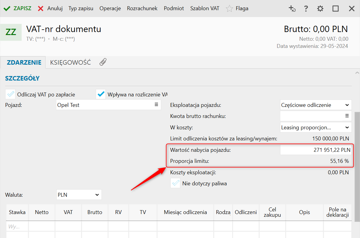 Po wykonaniu powyższych operacji, podczas wprowadzania do ewidencji zapisów dotyczących leasingu proporcjonalnego, Wartość nabycia pojazdu oraz Proporcja limitu podpowie się automatycznie.