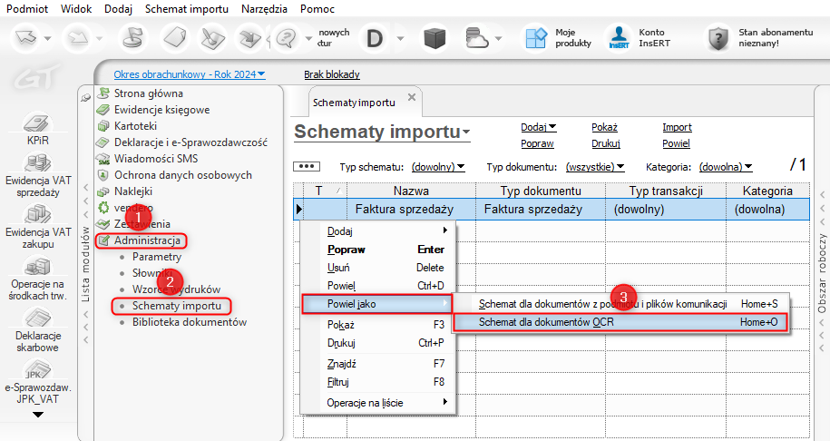Od wersji 1.80 program Rachmistrz GT umożliwia powielenie schematu importu dla dokumentów z podmiotu i plików komunikacji jako schemat dla dokumentów OCR. W tym celu należy: