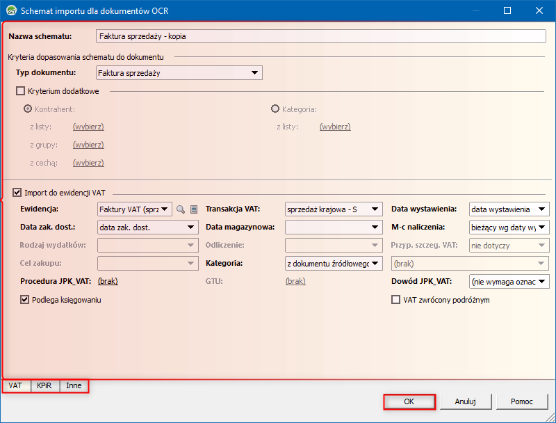 2. W oknie Schemat importu dla dokumentów OCR zostaną przeniesione ustawienia z pierwotnego schematu, a do nazwy zostanie dopisana "kopia". Zweryfikować poprawność schematu na wszystkich zakładkach, a w razie potrzeby dokonać potrzebnych modyfikacji. Schemat zapisać przyciskiem OK.
