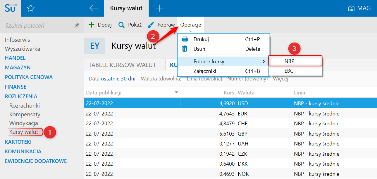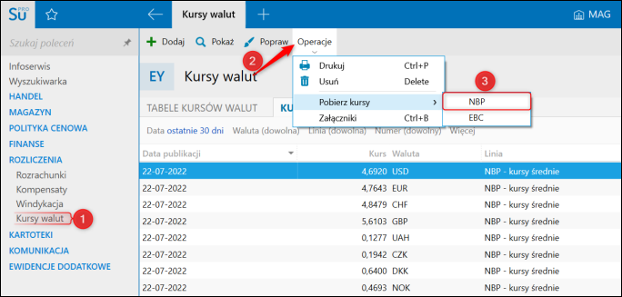 1. Przejść do modułu Kursy walut, a następnie z górnego menu operacje wybrać Pobierz kursy – NBP.