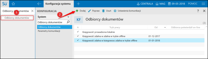 1. W wyszukiwarce wpisać Odbiorcy dokumentów, a następnie w górnym menu kliknąć Dodaj.