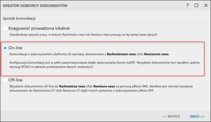 2. W oknie należy zaznaczyć On–line oraz przejść Dalej.