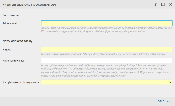4. W oknie należy wpisać Adres e-mail, na który zostanie wysłane zaproszenie do księgowości, która będzie pobierać dokumenty, wypełnić Nazwę, Hasło szyfrowania (opcjonalnie) oraz wybrać Początek okresu obowiązywania. Po wypełnieniu pól przejść Dalej.