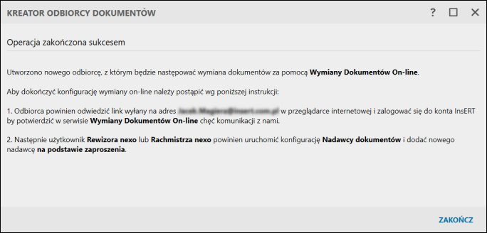 5. W ostatnim oknie program poinformuje o utworzeniu nowego odbiorcy dokumentów i wysłaniu zaproszenia, a także pokaże instrukcję z krokami, które musi wykonać księgowość.