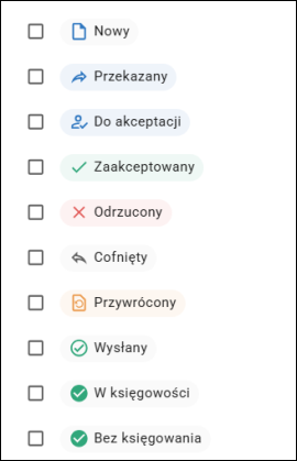 Nowy – dokumenty dodane do aplikacji, nieprzypisane do żadnego użytkownika ani nieprzesłane do księgowości.