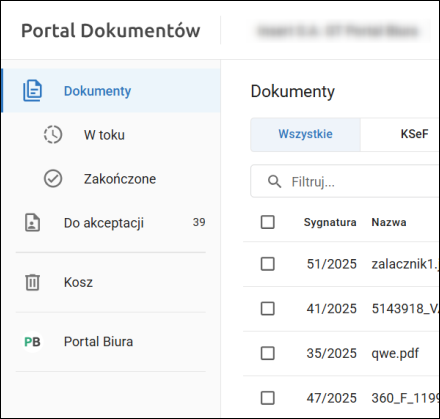 Dokumenty – wszystkie dokumenty dodane przez użytkownika lub te, w których obiegu brał udział, oprócz tych w koszu.