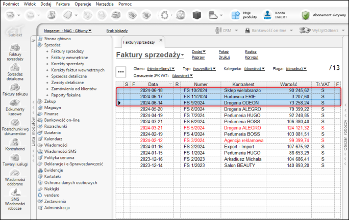 1. Przejść do modułu, gdzie znajdują się dokumenty, które będą miały zmienioną kategorię i zaznaczyć te, których kategoria zostanie zmieniona lub nadana.