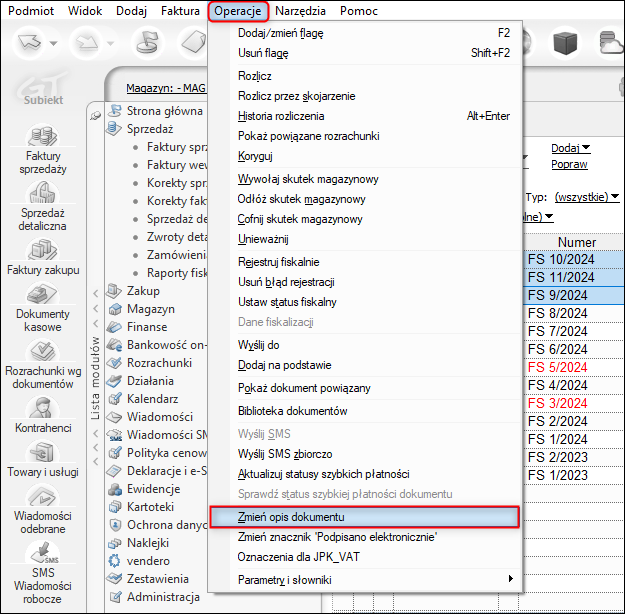 2. Po zaznaczeniu z górnego menu wybrać Operacje – Zmień opis dokumentu.
