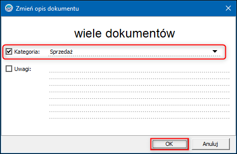 3. W oknie Zmień opis dokumentu zaznaczyć opcję Kategoria i wybrać z listy tę, która zostanie wprowadzona na zaznaczonych wcześniej dokumentach. Zmianę zatwierdzić przyciskiem OK.