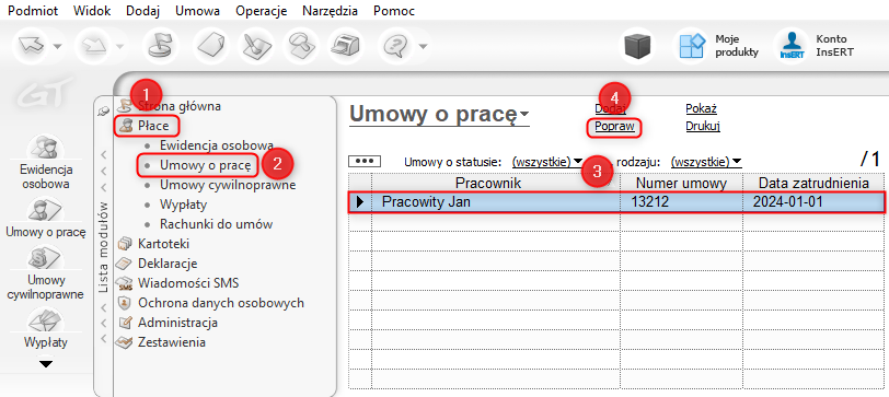 1. Z listy modułów wybrać Płace – Umowy o pracę, zaznaczyć umowę, dla której zostanie ustawione naliczanie składek FP i FS i wybrać opcję Popraw.