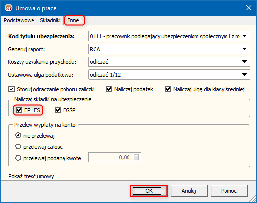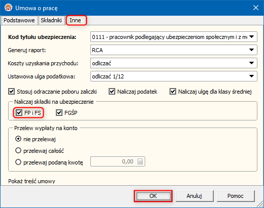 2. W oknie Umowa o pracę przejść na zakładkę Inne i włączyć opcję FP i FS w sekcji Naliczaj składki na ubezpieczenie. Zmiany zapisać przyciskiem OK.