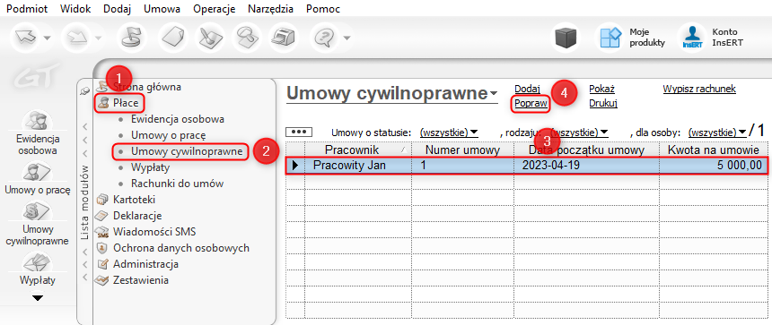 1. Z listy modułów wybrać Płace – Umowy cywilnoprawnezaznaczyć umowę, dla której zostanie zmieniony raport ZUS i wybrać opcję Popraw.