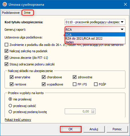 2. W oknie Umowa cywilnoprawna przejść na zakładkę Inne i wybrać odpowiednią wartość w polu Generuj raport. Zmiany zapisać przyciskiem OK.
