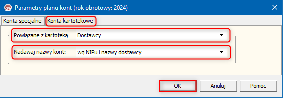 2. Przejść na zakładkę Konta kartotekowe i w polu Powiązane z kartoteką wybrać wartość Dostawcy, a w polu Nadawaj nazwy kont wskazać wg NIPu i nazwy dostawcy. Ustawienie zapisać przyciskiem OK.