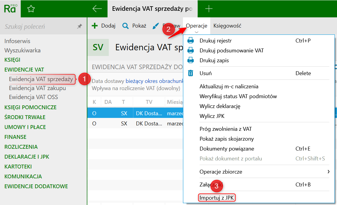 1. Przejść do modułu Ewidencja VAT Sprzedaży, a następnie z górnego menu Operacje wybrać Importuj z JPK.