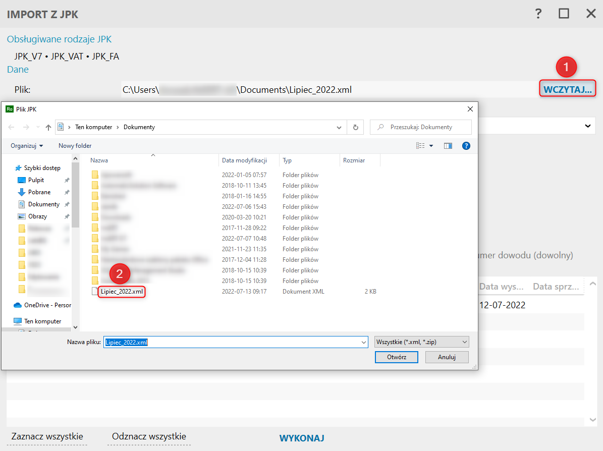 2. W oknie importu kliknąć przycisk Wczytaj, który wywoła okienko, gdzie trzeba wskazać plik JPK z dysku.