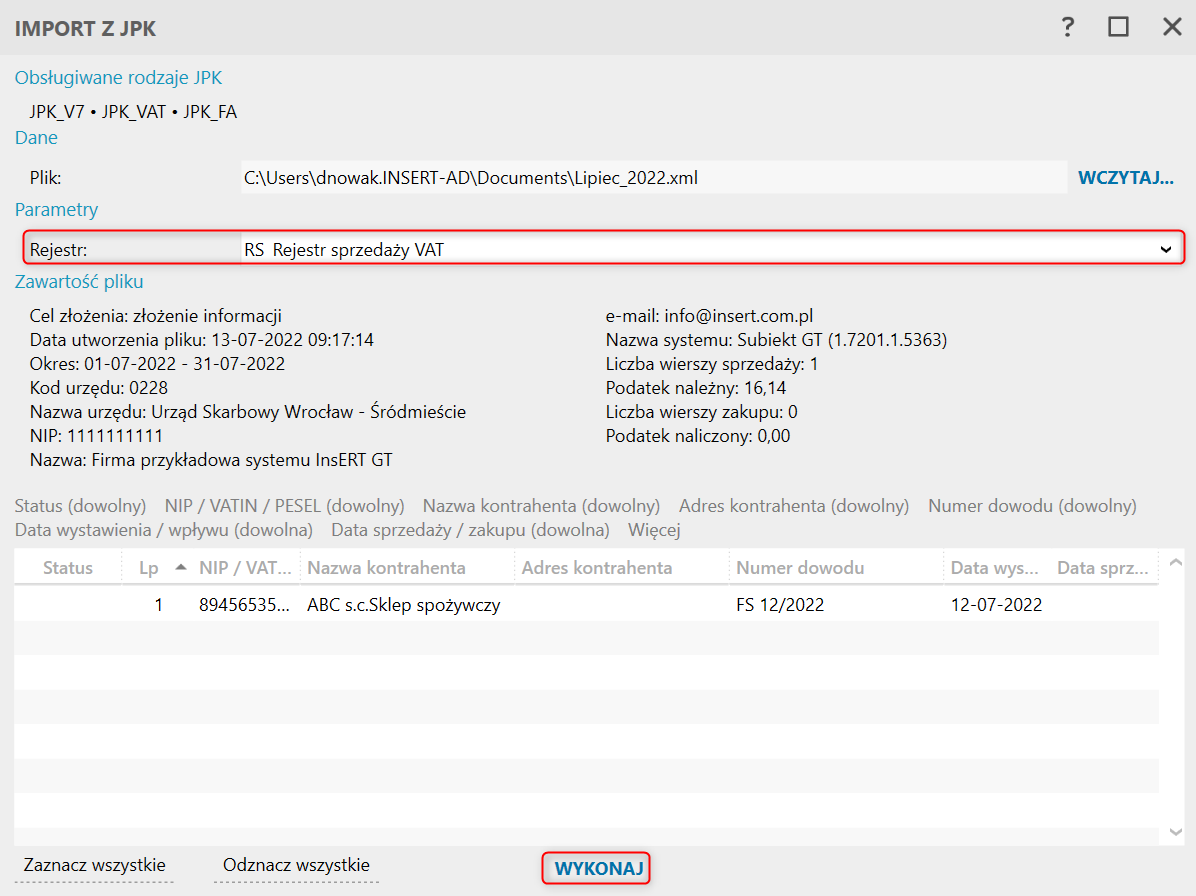 3. W oknie, które się pojawi, wskazać Rejestr, w którym program będzie dodawał dokumenty, następnie zaznaczyć dokumenty, które mają zostać dodane. Przycisk Wykonaj zacznie procedurę dodawania dokumentów do programu.