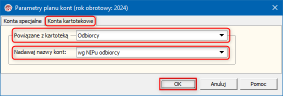 2. Przejść na zakładkę Konta kartotekowe i w polu Powiązane z kartoteką wybrać wartość Odbiorcy, a w polu Nadawaj nazwy kont wskazać wg NIPu odbiorcy. Ustawienie zapisać przyciskiem OK.